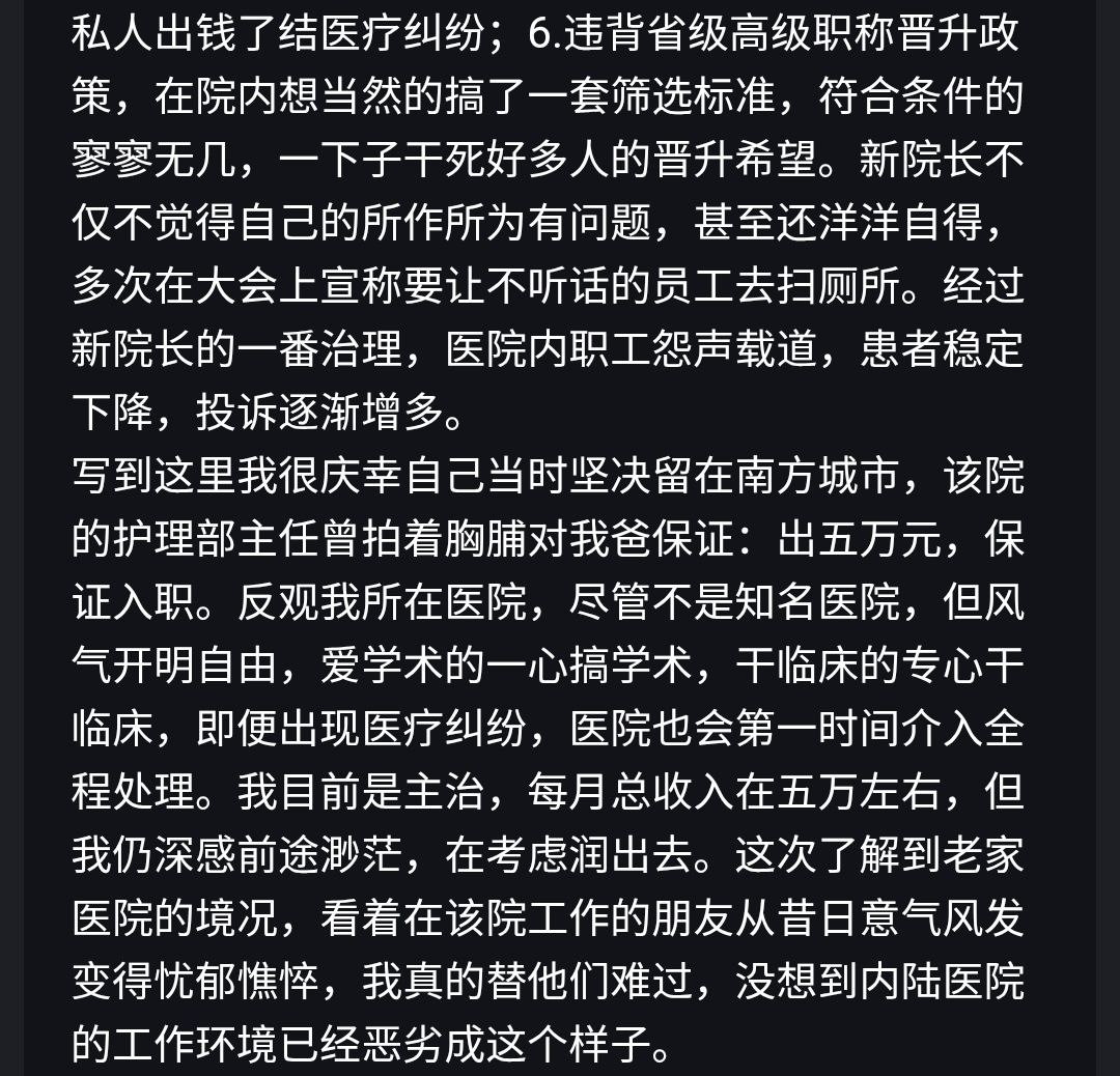 #大自爆运动 南方工作的一主治医师爆料老家汉中某三甲医院:两任院长贪腐被抓,药剂科上交赃款上亿,新“博士院长”上任后,六大狠招:行政查房训狗,每月生日会洗脑,强制员工12345平台刷好评,计划大规模降薪,办学习班让医护职工脱产写检讨,自创奇葩晋升政策。大会上更多次扬言让不听话员工扫厕所!