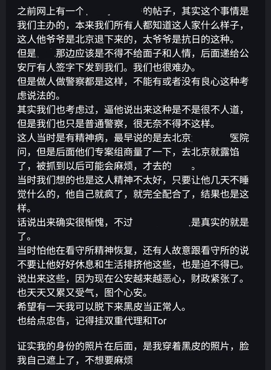 #大自爆运动 自称网上某热点案件的办案警察投稿:案件涉及精神病人,专案组为了避免露馅,不按规定把他送去北京医院做精神鉴定,反而剥夺嫌疑人的睡眠长达数天,使其发疯,完全配合招供。 甚至在看守所时也继续迫害他,防止他精神恢复。 他感叹:在中国做人做警察,不能考虑良心! (图片经处理保护投稿人)